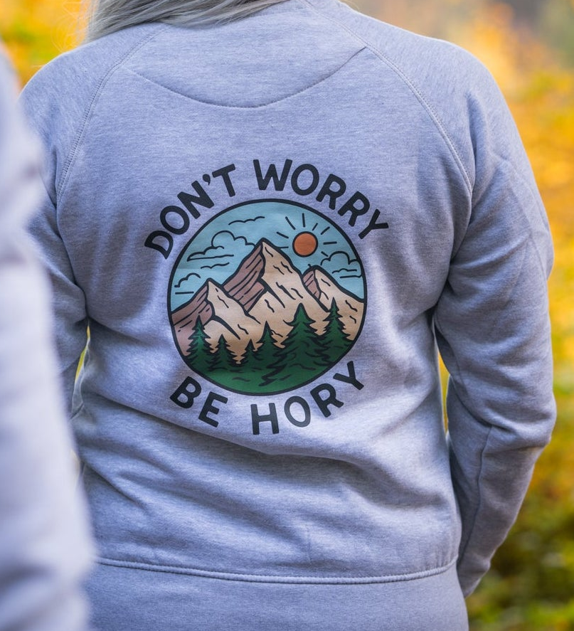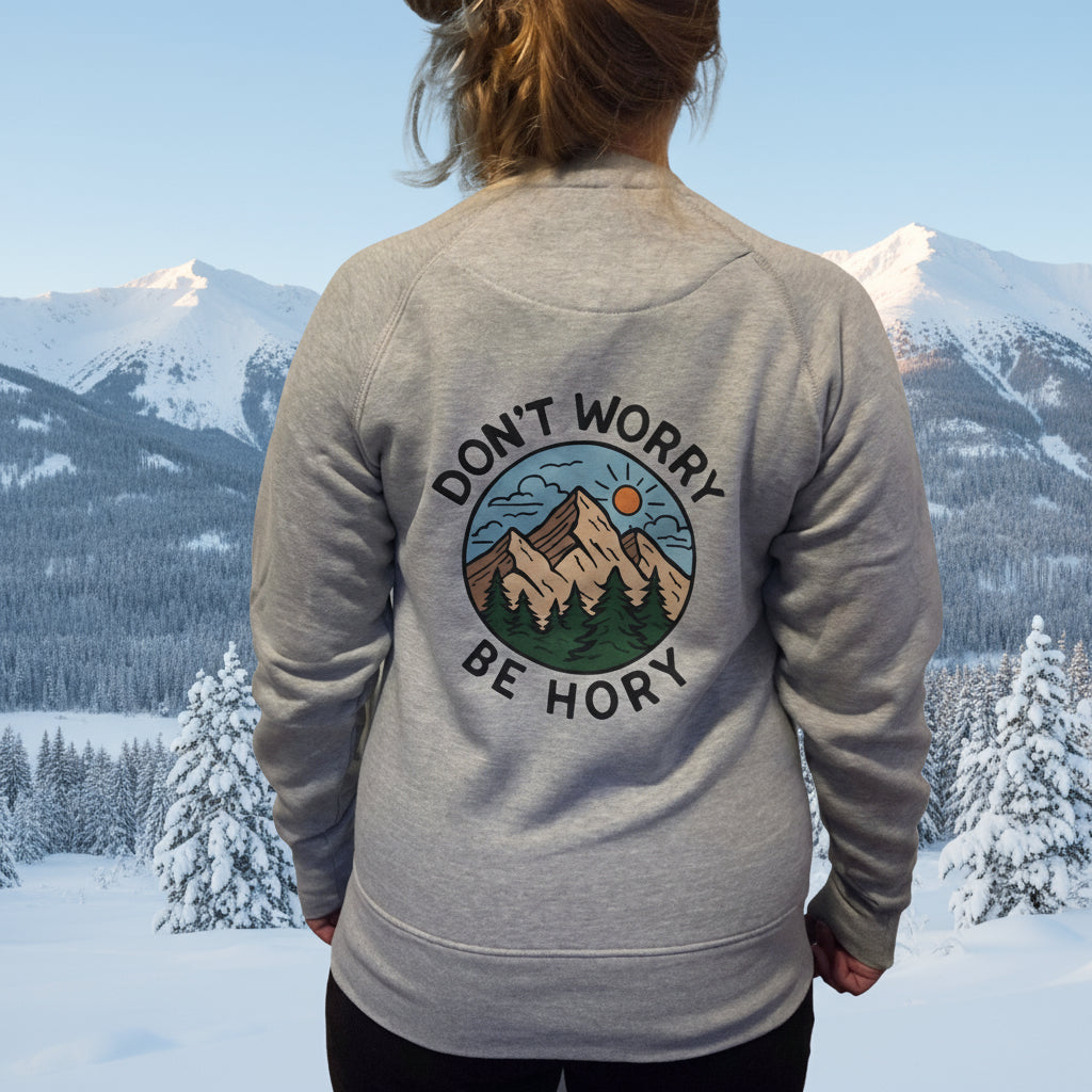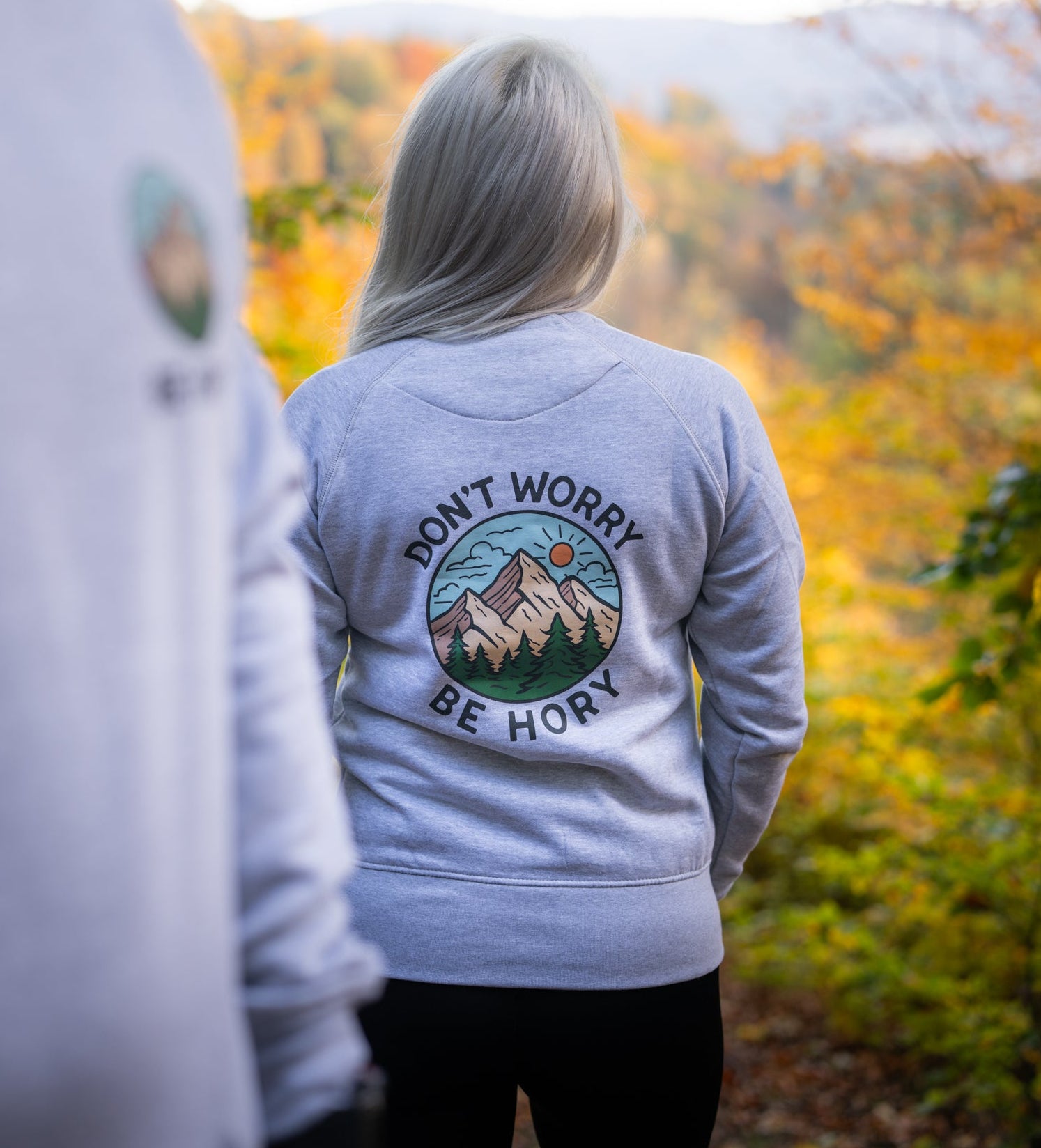 Kdo potřebuje kapuci, když má styl? Tahle šedá mikina tě zahřeje i bez ní – ideální pro ty, co se nepotřebují schovávat před světem (ani před počasím). Měkká, pohodlná a s humorem, který se neztratí ani v mlze na hřebeni. Na prsou logo Be Hory, aby všichni věděli, že nejsi z města, ale z přírody… minimálně duší. A na zádech nese krásný motiv hor, lesa, nebe a černé na šedém: Don’t Worry, Be Hory.