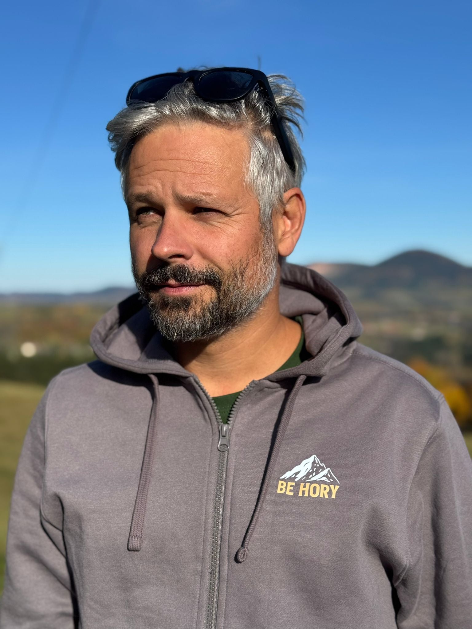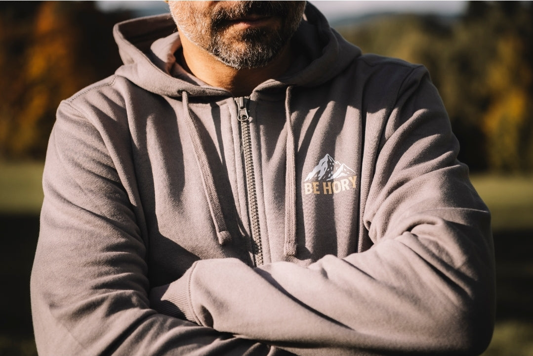 Na zádech se pyšní heslem, který vystihuje všechno: Don’t Worry, Be Hory.