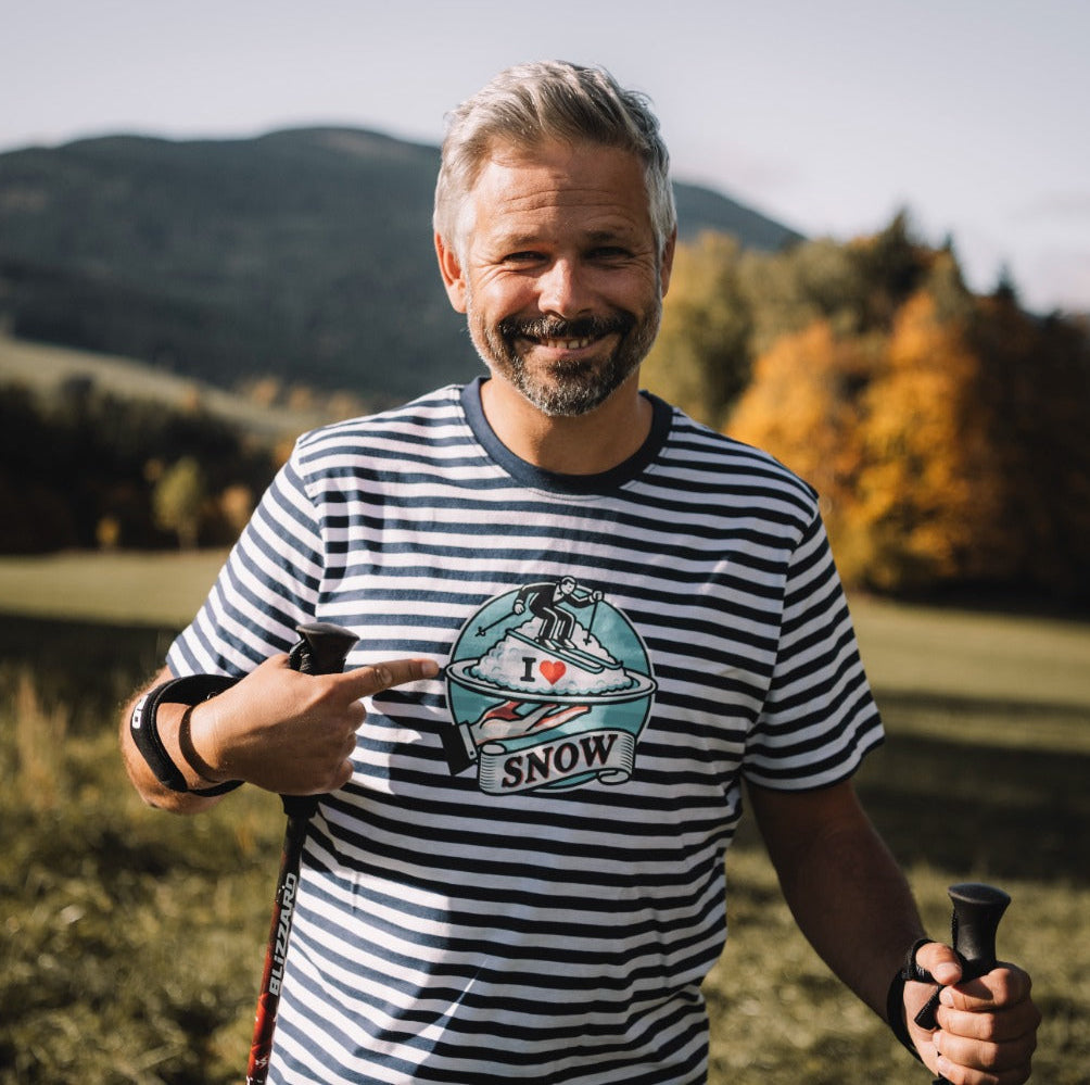 Naše pruhované modro-bílé unisex tričko s lyžařem a nápisem “I love snow” je prostě jako dělané pro všechny, kdo chtějí vypadat jako stylový námořník, co se omylem zamiloval do hor. Stačí obléct a hned je jasné, že sníh je tvoje moře!