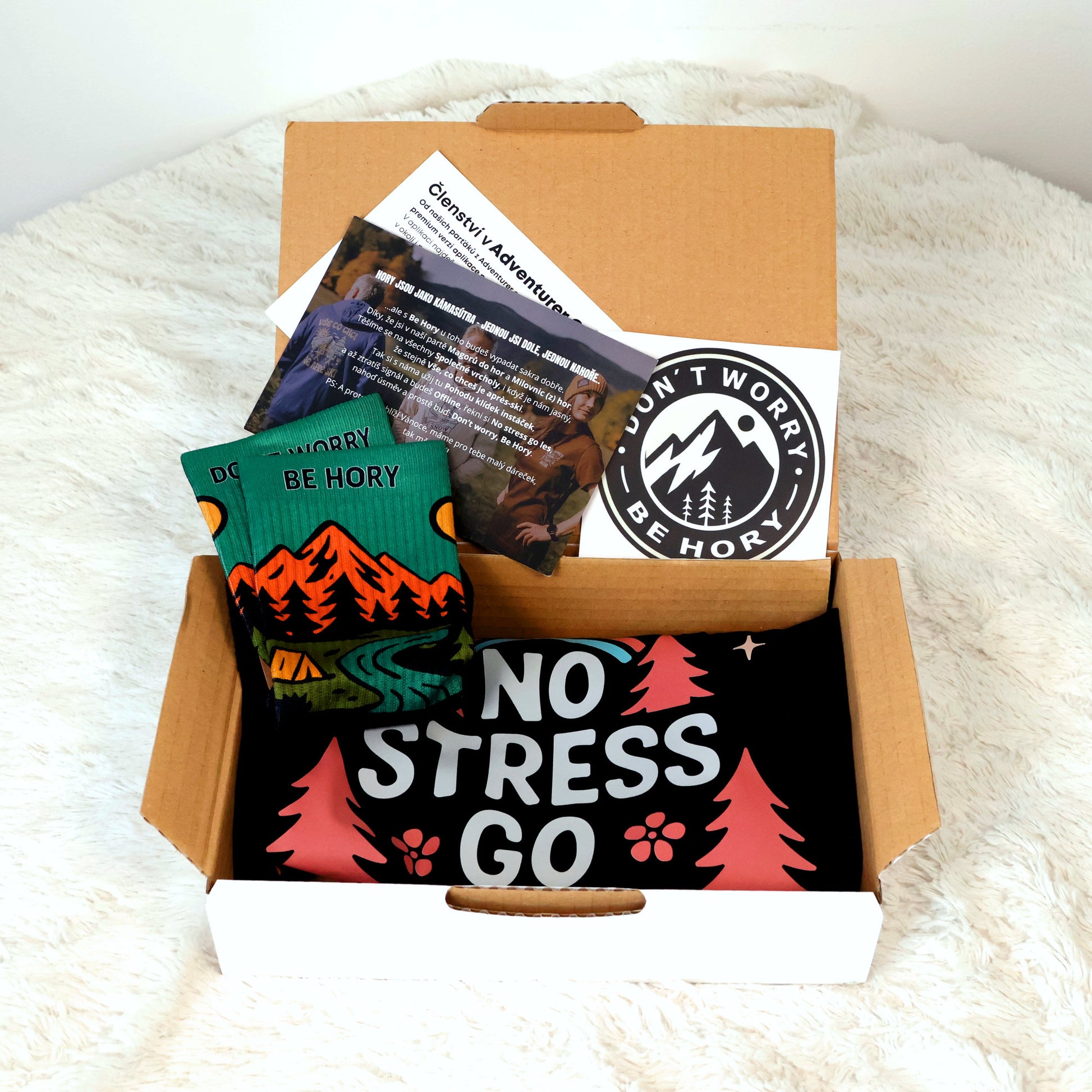 Uvnitř najdeš dámské tričko No stress go les, které ti připomene, že nejlepší terapie je mezi stromama… a k tomu stylové ponožky Don’t worry be hory, aby byl tvůj horský vibe od hlavy až k patě.